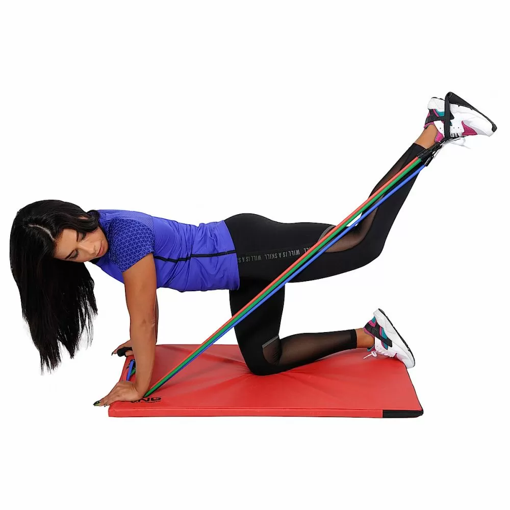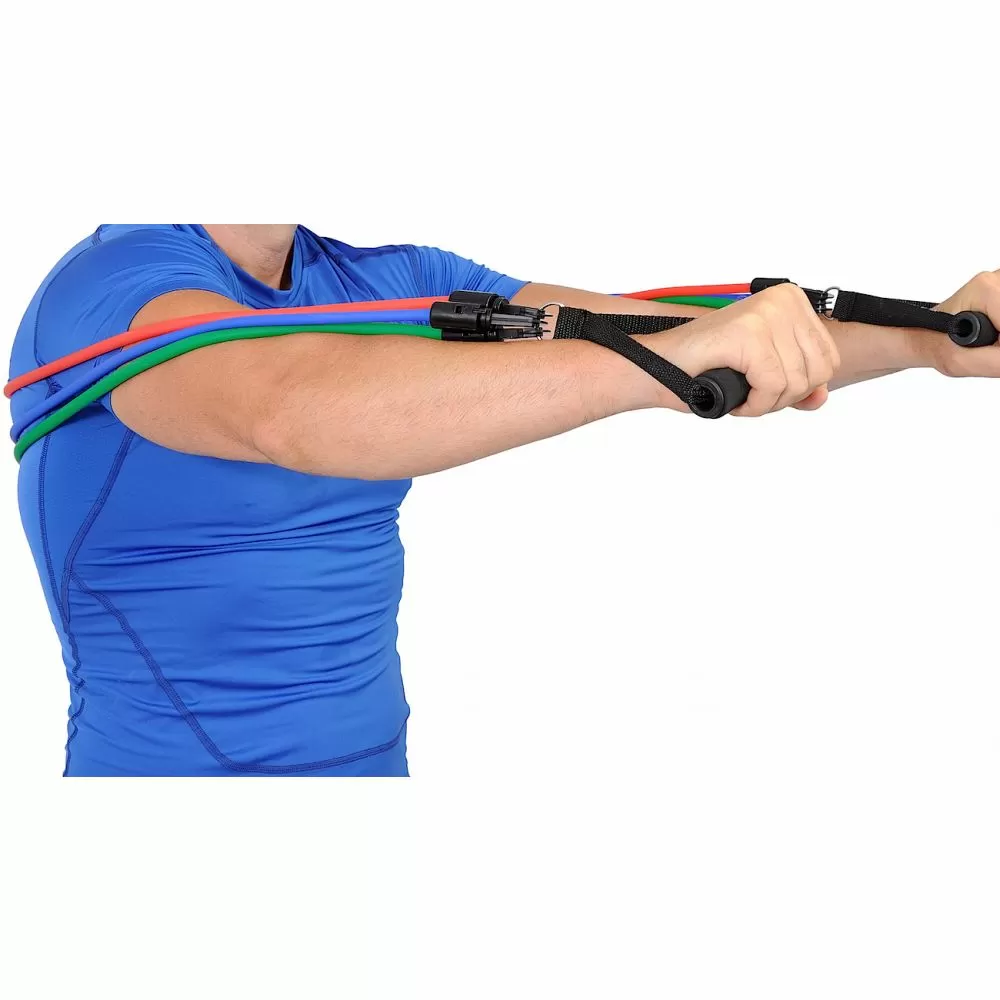 · set sadrži 3 gume različite rastezljivosti (jačine), 2 ručke (rukohvata ) koji se lako kače na odgovarajuću gumu, i platnenu kesu za prenošenje