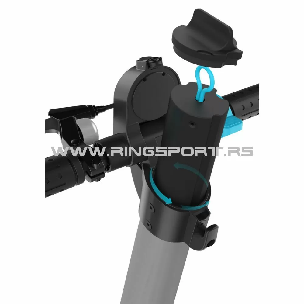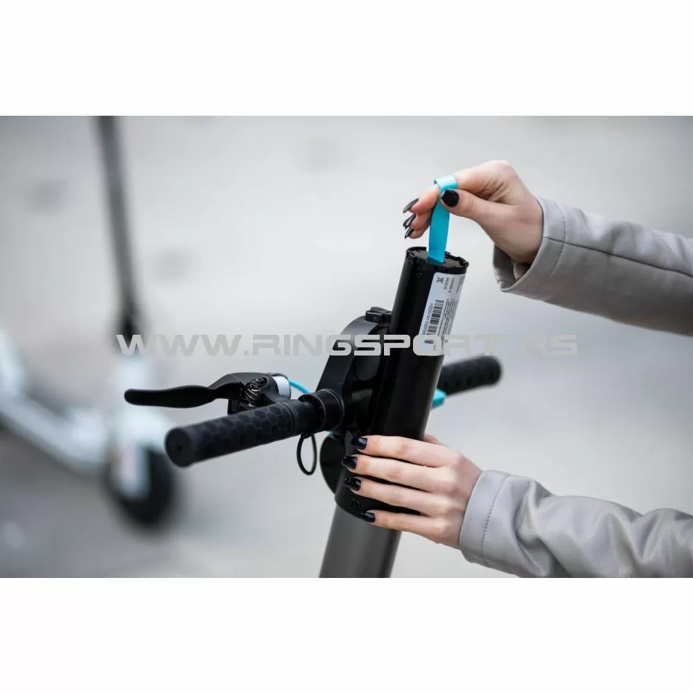 Baterija je izmjenjiva i vrlo lako se mijenja kao baterija na mobilnom telefonu. Može se ponijeti rezervan i vrlo brzo zamijeniti. Baterija se nalazi u vratu romobila.